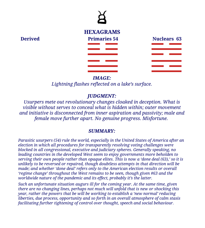 I went back to look at last year’s Yi throw and commentary and thought it interesting in that the Hexagram #54 was echoed in this year’s New Year’s Day Earthquake throw, Number Fifty One changing to Number Fifty Four (51,2 – 54).